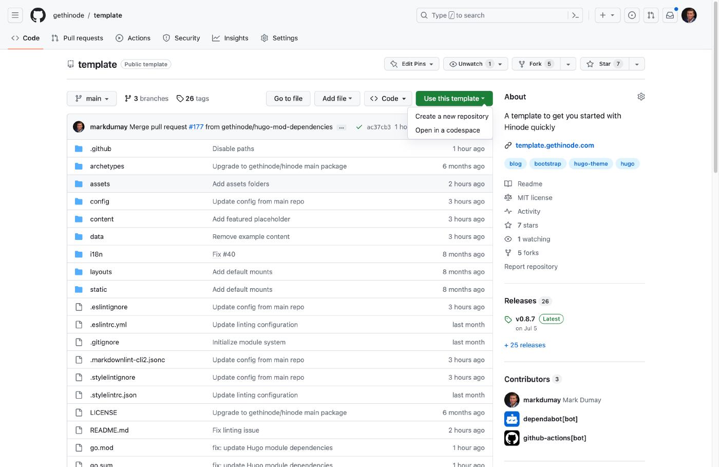 Hinode comes in two flavors: a template and a main theme . We will use the template as starting point for our new site, as it has several predefined settings that support automation. The main repository provides a regular theme that is compatible with Hugo’s module system. It is better suited if you prefer to manually maintain and publish your Hinode site1.