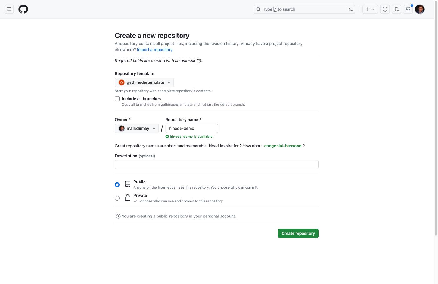 in your browser and click on the green button Use this template to create a new repository. You may need to sign in to GitHub for the button to become available. Provide a meaningful name for your repository, such as hinode-demo. The repository’s visibility can be either private or public. Public repositories can be seen by anyone, such as open-source projects. Private repositories are only visible to yourself, or to anyone you have granted access. Lastly, click on the green button Create repository from template to create your repository.