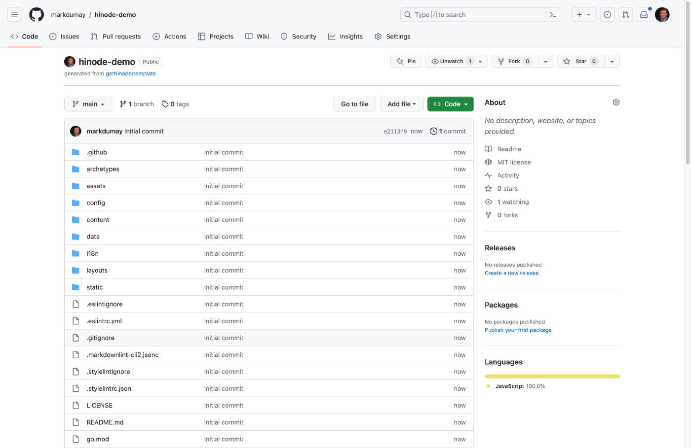 cd hinode-demoNext, use the command npm install to download and install the various packages. npm will store these files in the hinode-demo/node_modules folder. The script downloads and installs the latest Hugo binary automatically. In this approach, the Hugo binary is linked exclusively to your repository, minimizing potential version conflicts on your local machine.