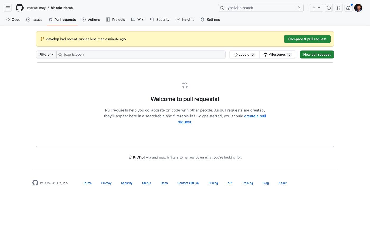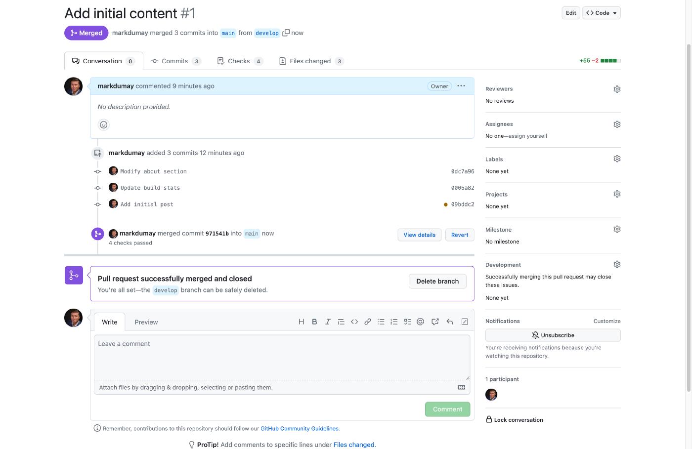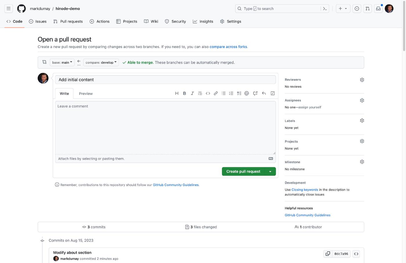 With your changes committed to the remote develop branch, you can now merge the changes with the main branch. Head over to your repository on GitHub to submit a Pull Request (PR). Click on the green button New pull request within the menu Pull Requests to do so. Enter a descriptive title for the PR, or confirm the default title suggested by GitHub. Click on the green button to submit the PR, which triggers GitHub to run several checks.