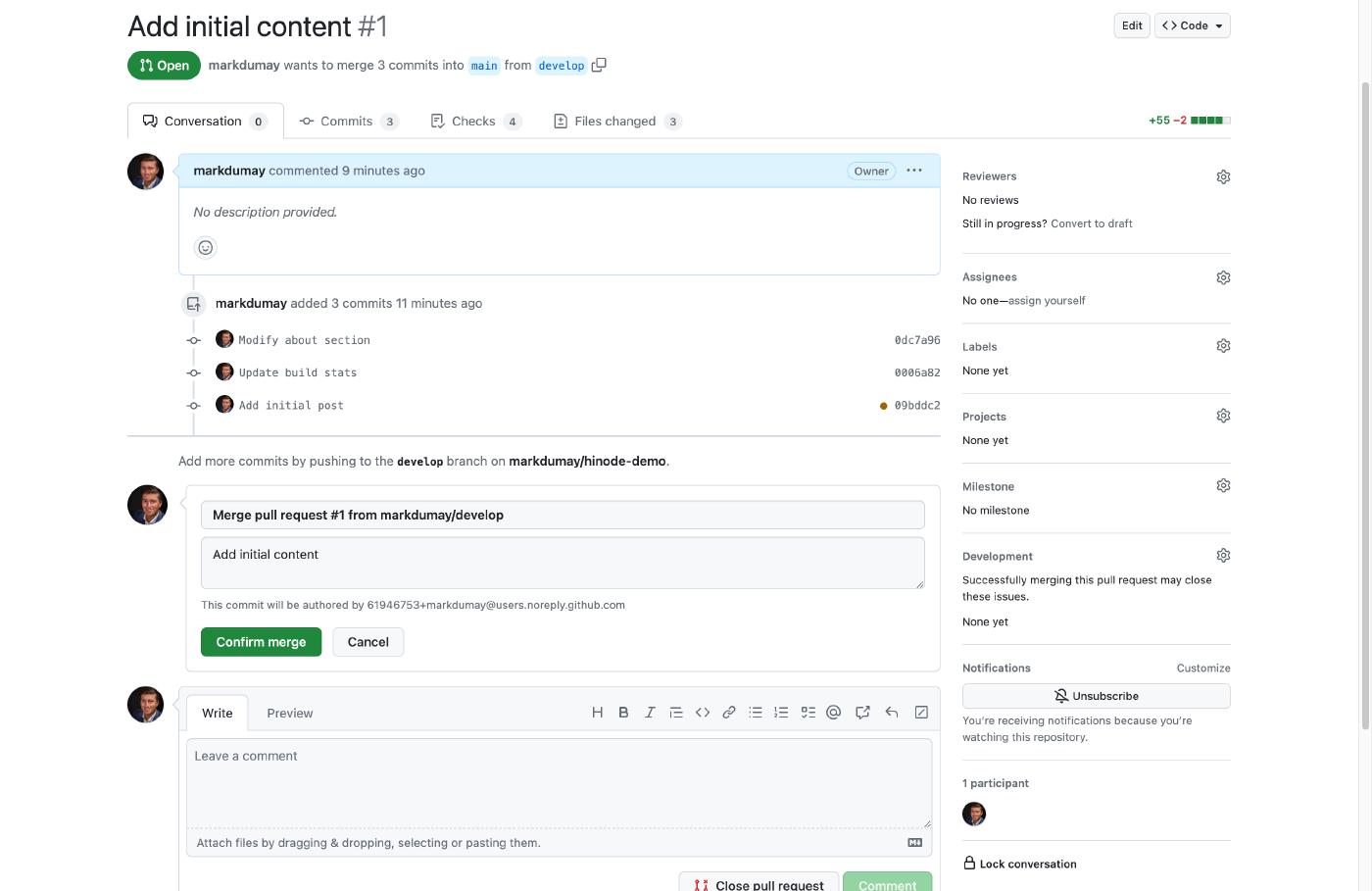 By default, Hinode runs a linting test and builds the web site with the latest stable (LTS) versions of Node.js. The linting test is the same test that ran in the previous step. The tests act as a sort of safeguard to prevent changes breaking the main repository. You can confirm the merge when all checks have passed successfully. You can then observe the commit message associated with the content folder when you head back to the code of the main repository.
