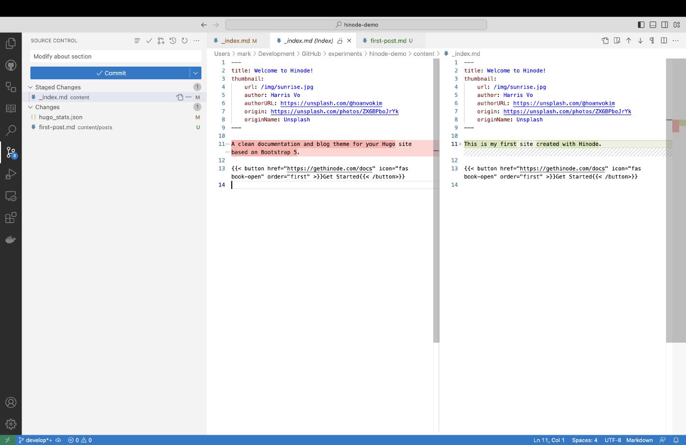 Summary: 0 error(s)Head over to VSCode’s Source Control to view the pending changes. Click on the file _index.md to open the code inspector. VSCode will then show the differences between the previous version and current version of the file. Content that has been replaced or removed is marked red, and content that has been added or modified is marked green. Verify the change and click on the + button to stage the modification of the _index.md file. Enter a descriptive commit message such as Modify about section. When done, click on the blue Commit button to commit the changes to the develop branch.