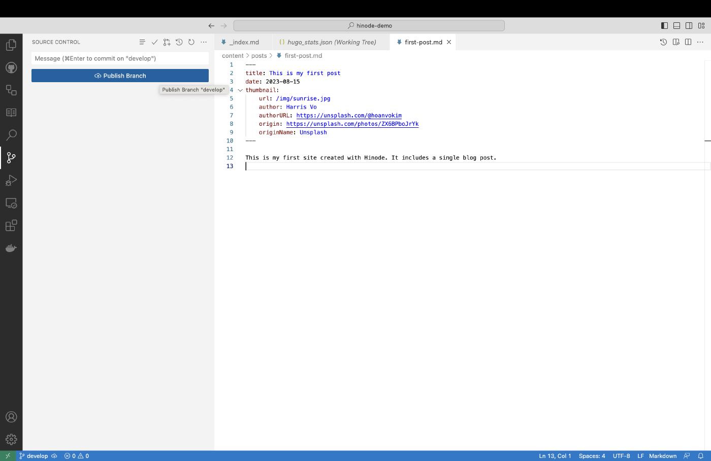 This is my first site created with Hinode. It includes a single blog post.The content contains frontmatter, denoted by --- markers, and main content. The frontmatter captures the metadata of the page, and usually includes at least a title and a date. The thumbnail is a special variable introduced by Hinode that captures the metadata of our page thumbnail. The image itself is mounted from the main Hinode repository into the assets folder upon build.