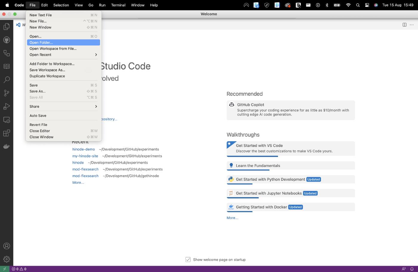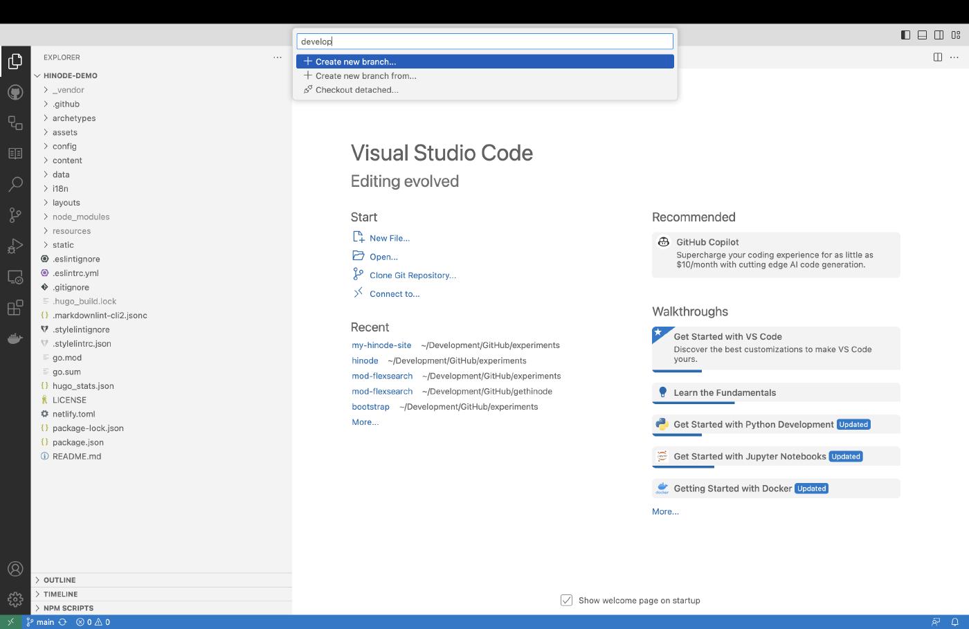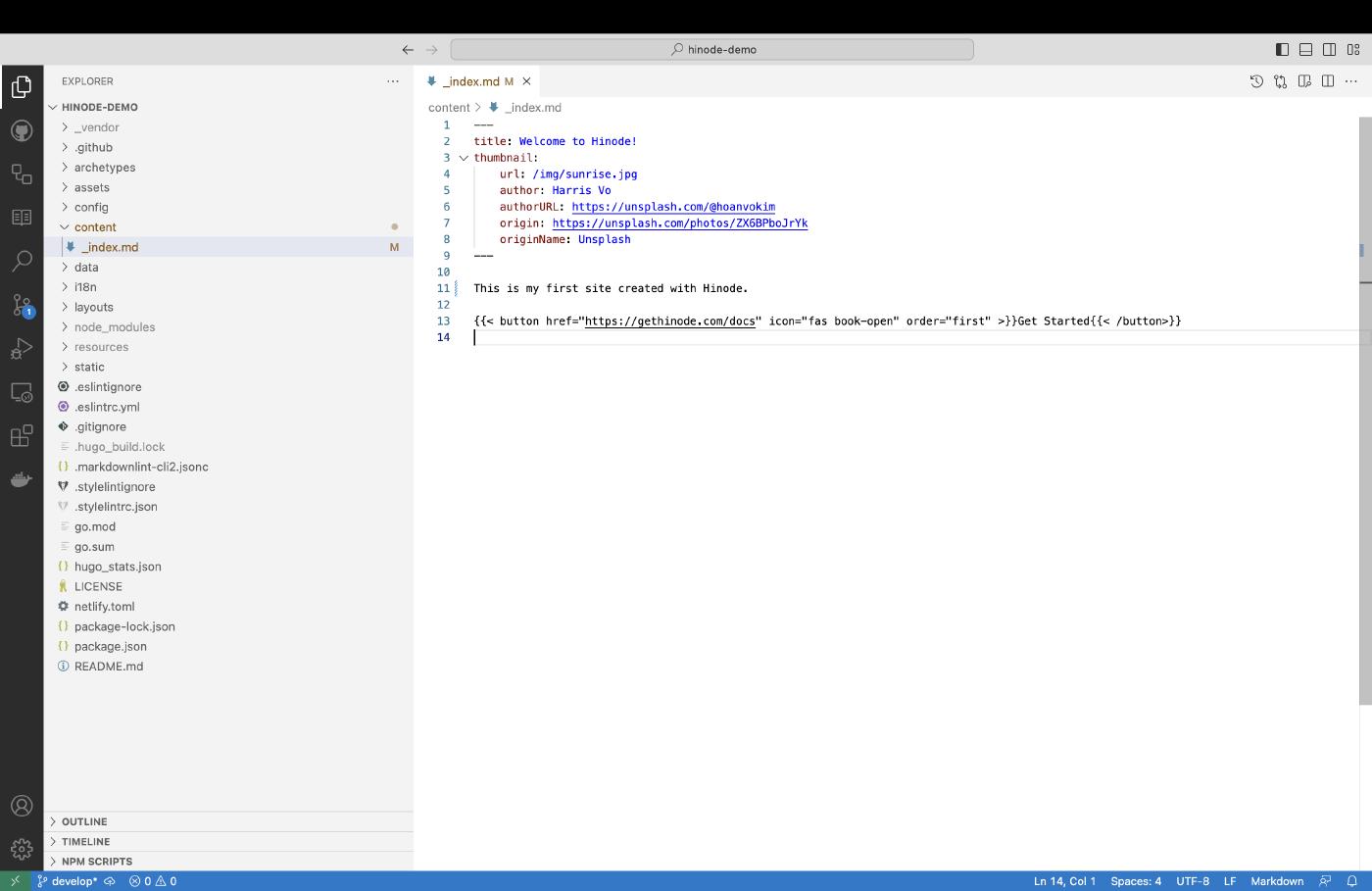 Hinode uses Hugo , a popular open-source generator, to generate a static website. Static websites do not require a database and can be hosted virtually anywhere. In this guide, we will set up a new site using a template from GitHub. We will then edit our Markdown content with Visual Studio Code (VSCode). Lastly, we will submit our changes to the main branch.