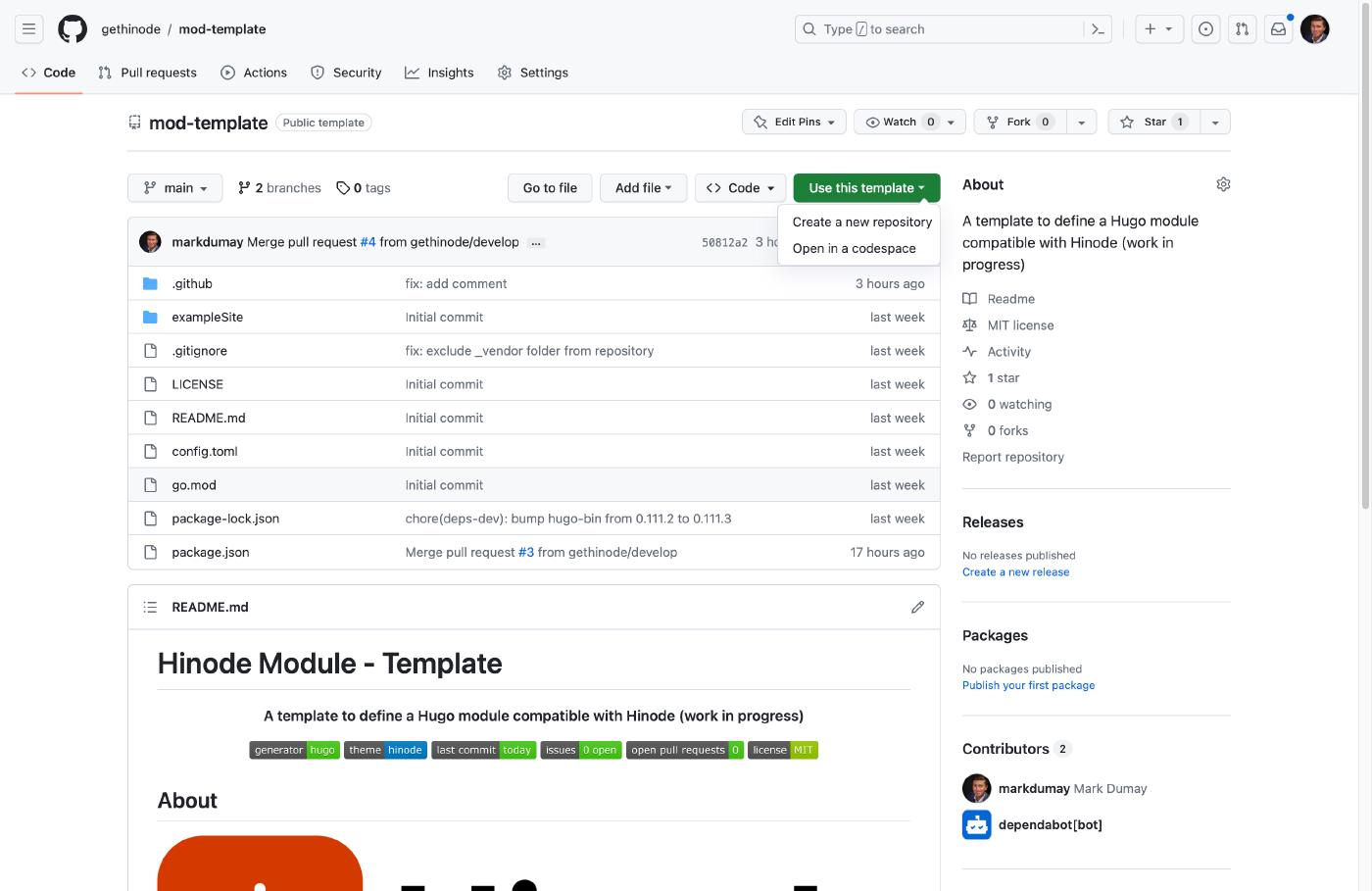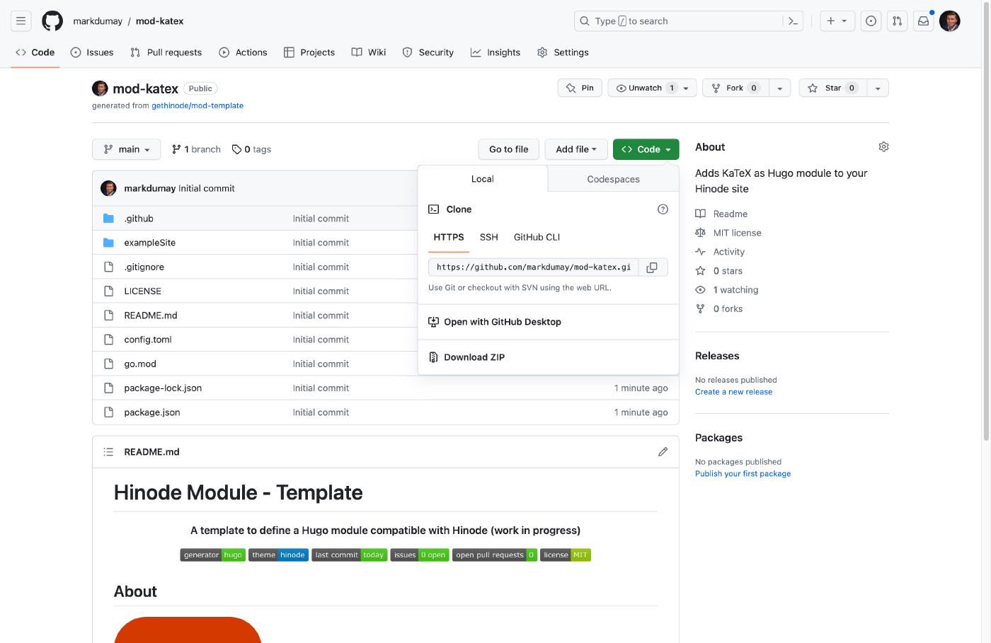 Hinode maintains a module template to quickly get you started with developing your own modules. Navigate to the repository on GitHub and click on the button Use this template. Next, fill in the repository settings such as the name and description, and click on the button Create repository. When GitHub has initialized the repository, click on the <> Code button and copy the remote git URL (https).