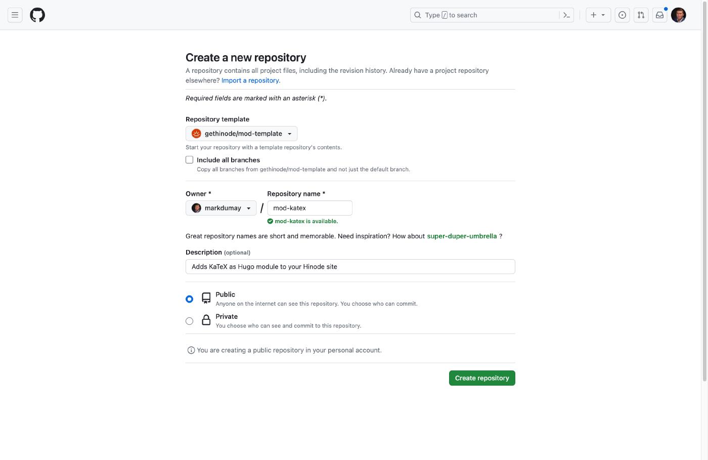 Press Ctrl+C to stopWe have now created a new module that wraps the functionality of KaTeX. You can now easily include the module as core module or optional module in your Hinode site. Visit the modules section for more instructions. As a next step, you could consider to automate the dependency tracking, merging, and publication of new releases for your module. Your module already inherited several workflows from the module template. Visit the module development section for more information.
